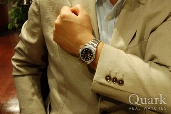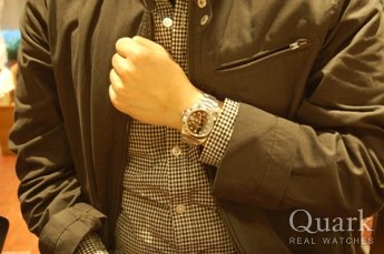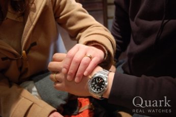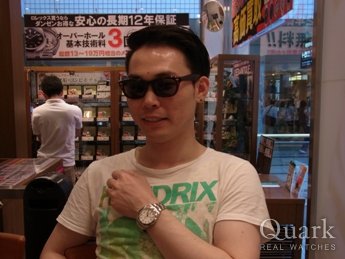 以前にも青サブやGMTマスターなどを持っていましたが、今回は一緒に来た彼女の紹介でクォークで買いました。保証も充実しており、これからはずっと大切に使い、この時計で2人の大切な時間を刻みたいと思っています。