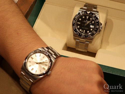 O様 いつもクォーク名古屋店を御利用頂き、誠にありがとうございます。初めてGMT-MASTERをお求め頂きましたが、とても雰囲気の良いお時計を選択されましたね!ダイヤルの焼けも素晴らしく、少しヴィンテージの趣もありますので、これから使用しながら時計を育てて頂きたいです。今までのお時計とかなりデザインが異なりますが、装いに合わせて選ぶ楽しみが増えましたね!他のお時計同様、しっかりサポートに努めさせて頂きますので、何か気になる事が御座いましたら、遠慮なく御相談下さい。
