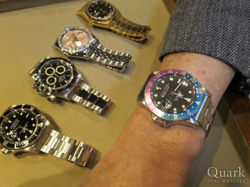 F様、この度はクォークなんば店をご利用頂きまして誠に有難うございます。お忙しいところ何度もご足労頂きまして感謝致しております。今回ご購入頂きましたRef.16710 GMTマスターII 赤青ベゼルは生産終了後に資産価値がどんどん上がってきた人気モデルです。特に赤青ベゼル(通称ペプシ)はお問い合わせが最も多いカラーとなっております。こちらのお時計はベゼル部分が良い感じに退色していてヴィンテージっぽい雰囲気となっています。F様のお好みに合ったようで嬉しく思います。今後も何かございましたら私までお気軽にご相談下さいませ。またこちらまで足を伸ばされた際はクォークなんば店に是非お立ち寄り下さいませ。