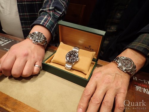 S様 度々クォーク仙台店をご利用くださいまして誠にありがとうございます。初のGMTマスターIIですね。しかも初期型のシングルブレス、先端ドット、トリチウム夜光です。これまでのロレックスライフから、このタイミングでこちらのモデルとは、S様も想像されていなかったことと存じます。然しながら、ご縁ですね!新たな人生のスタートを切ったS様にとって、良き相棒となってくれると私は信じております。これまでに無い雰囲気をご堪能くださいませ。今後とも末長いお付き合いの程、宜しくお願い申し上げます。