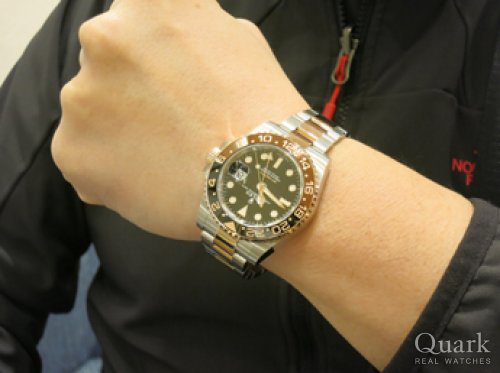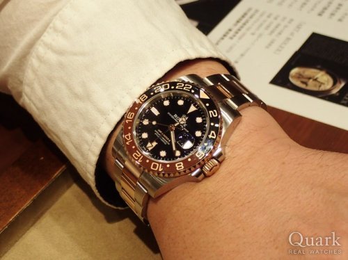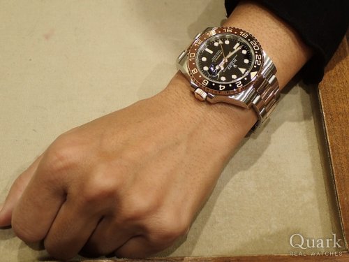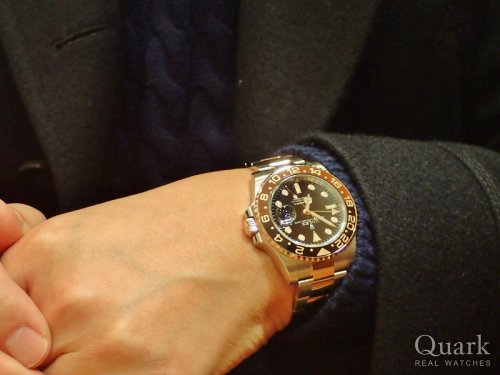 この度は、クォーク横浜店をご利用いただき誠にありがとうございました。ご来店の際に着用されていたヴィンテージのロレックスが凄く素敵でしたが、こちらのGMTマスターIIもとても似合っていらっしゃいました。エバーローズゴールドとツートーンカラーのベゼルは完璧な相性で、スポーティーなデザインながらも品格を感じさせるカラーリングです。沢山の機械式時計を所有していらっしゃるT様ですが、現行モデルは初めてとのお話でしたので、使い心地や感想をお聞きするのが楽しみです。またいつでもお立ち寄りくださいませ。今後ともよろしくお願いいたします。 クォーク横浜店 長本