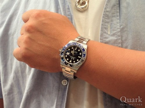 GMTマスターII 青黒やサブマリーナーとも悩みましたが、5年、10年先を考えると、永く使えると思い、ブラックベゼルを選びました。担当の垣見さんが着けていて良く見えたのとGMTのベゼルのデザインや高級感に惹かれました。