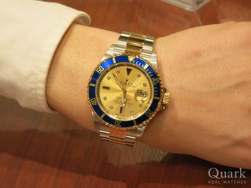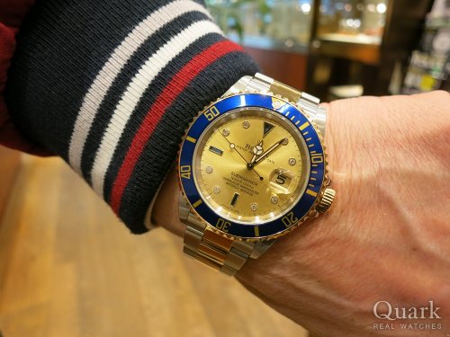スポーツモデルの中でもコンビを探していて、当初はGMTマスターのブラウンダイヤルを購入する予定でしたが、タイミング良くサブマリーナー(青サブ)でシャンパンダイヤルが入荷したので、こちらを購入しました。以前、グレーダイヤルを所有していた事もあったので、シャンパンダイヤルが購入の決め手です。派手過ぎず上品な印象のサファイア&ダイヤ入りの文字盤が気に入っています。
