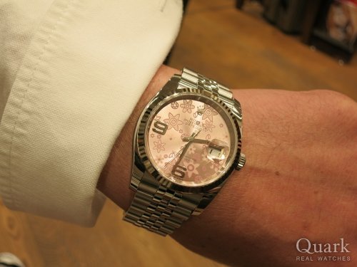 H様 いつも大変お世話になります。この度はデイトジャスト(Ref.116234)ピンクフラワーダイヤルをお買い求め頂きまして誠に有難うございました。ご依頼頂いてから入荷まで日数が掛かってしまい申し訳ありませんでした。(珍しいダイヤルにつき、ほとんど入荷がない状況で御座いました。)初めて見てから、今回お手に取って頂く間に目にする機会が無かったとお伺いしましたが、実物の時計も気に入って頂けて大変幸いです。ホワイトゴールドのベゼルとダイヤルの華がマッチするデザインも素敵ですね!是非、末永くご愛用頂けます様、願っております。またお使い頂く中でご不明な点やご用命の際にはお気軽にお申し付け下さいませ。今後とも宜しくお願い致します。