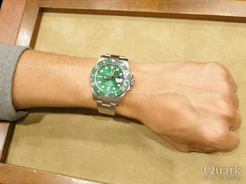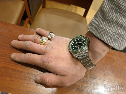 K様 この度はロレックス専門店クォーク広島店にてグリーン サブマリーナーRef116610LVをお買い求め頂きまして誠に有難う御座いました。他のモデルも見て頂きましたが、実用性、人気、資産価値を考えると、ご検討頂いた中では、一番ご希望に合ったモデルですね!また、ご愛用頂いております存在感抜群のリングとも相性バッチリですね!是非、末永くご愛用頂けます様、願っております。またお使い頂く中でご不明な点やご用命の際にはお気軽にお申し付け下さいませ。今度とも宜しくお願い致します。