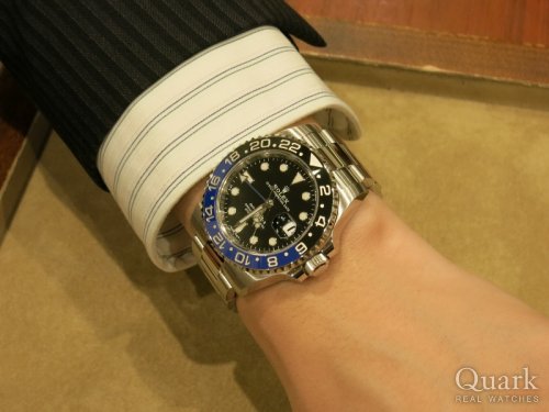 N様 この度はクォーク広島店をご利用頂きまして誠に有難う御座いました。モデル発表から3年以上が経過してもなお流通量が増えずにプレミア化しているGMTの青黒モデルですが、まさにN様探し求めておられた人とかぶらないスポーツロレックスの代表格ではないでしょうか。先代モデルの赤青・赤黒ベゼルほどカジュアル過ぎず、程よい大人の雰囲気が感じられる高級感あるデザインでオンオフ問わず活躍してくれるモデルです。N様に末永くご愛用頂ける様、私もしっかりとサポートさせて頂きますので今後ともクォーク広島店を宜しくお願い致します。 クォーク広島店 岩田