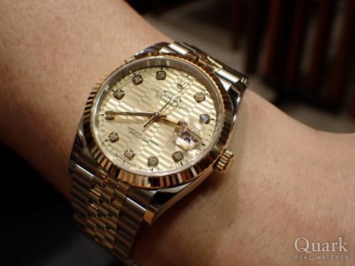 O様、この度はクォーク神戸店をご利用頂き誠に有難うございます。お選び頂きましたデイトジャストは、文字盤がフルーテッドモチーフに10Pダイヤモンドが輝く非常に珍しいタイプとなります。数少ないモデルでしたが、今回はタイミング良くO様にご案内出来て私も嬉しく思っております。O様に大変良くお似合いでしたので、末永くご愛用頂ければ幸いでございます。今後とも、クォーク神戸店を何卒宜しくお願い申し上げます。