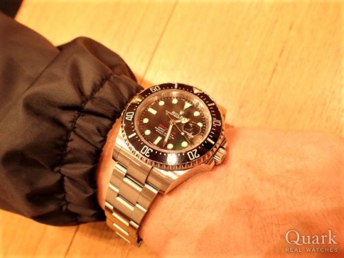 I様、この度はクォーク神戸店をご利用頂きまして誠に有難うございました。今回ご購入頂きました Ref.126600は、2017年から生産されているオールSS素材の現行シードゥエラーです。旧型モデル(Ref.116600)よりも3ミリ大きい43ミリケースとなり、さらに存在感が増しています。こちらのお品は登場から約1年ほどしかないマニアがひそかに注目する文字盤ディティール(スイスメイド表記位置にロレックスロゴが無い)の1本。I様もこだわられていたポイントでしたので、タイミングよくご案内ができ嬉しく思います。とてもお似合いでした。末永くご愛用下さりましたら幸いです。今後もご指名頂けますよう、しっかりとサポートをさせて頂きます。何かご要望などございましたら、私井内までお気軽にお申し付けくださいませ。また、ブレスレットの洗浄及び調整も無料で行っておりますので、お近くに来られた際には是非遊びにいらして下さい。心よりお待ち致しております。 クォーク神戸店 井内