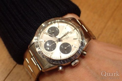 T様、この度はクォーク神戸店をご利用頂きまして誠に有難うございました。ご遠方より何度も足をお運び下さり、心より感謝を申し上げます。今回ご購入頂きましたRef.6239(シルバー上ビッグ)は、1963年頃から1960年代半ばあたりまで生産されていた、オールSS仕様の初代デイトナです。手巻き式でケースサイズは自動巻きデイトナよりも3ミリ小さい37ミリとなるのが特徴です。T様の探されていたディテールの個体をタイミング良くご案内でき、とても嬉しく思います。とてもお似合いでしたし、今後益々希少となってくるモデルです。末永くご愛用頂けましたら幸いです。今後もご指名頂けますよう、しっかりとサポートをさせて頂きます。何かご要望などございましたら、私井内までお気軽にお申し付けくださいませ。また、ブレスレットの洗浄及び調整も無料で行っておりますので、お近くに来られた際には是非遊びにいらして下さい。心よりお待ち致しております。                                   クォーク神戸店 井内