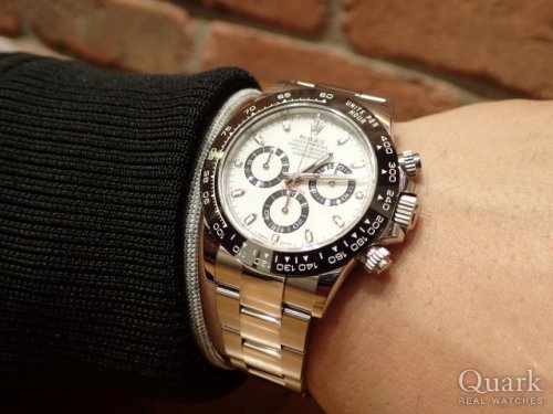 デイトナは黒のステンレスも所有していますが、ホワイト文字盤はなかなか手に入らないので、クォークさんで購入しました。以前も利用させてもらいましたが、在庫はが豊富で購入出来て良かったです。