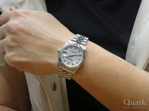 F様 この度は、クォーク神戸店をご利用くださいまして、誠にありがとうございます。この度お選び頂きましたデイトジャスト ホワイトシェルダイヤルは、ホワイトゴールドのベゼルやダイヤに加えて、角度によって表情を変えるホワイトシェルが輝きを放つ大変煌びやかなモデルでございます。華やかな雰囲気のF様に、良くお似合いで、とても綺麗でした。しかし、朝に突然「時計を買いに行くぞ!」と思い立って、宣言通り購入される旦那様の行動力と決断力には頭が下がります。男らしい素敵な旦那様ですね。羨ましいです。アフターサポートもしっかりと対応致しますので、お困りの際はご相談くださいませ。今後ともクォーク神戸店を宜しくお願い致します。
