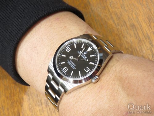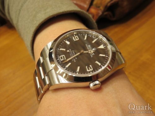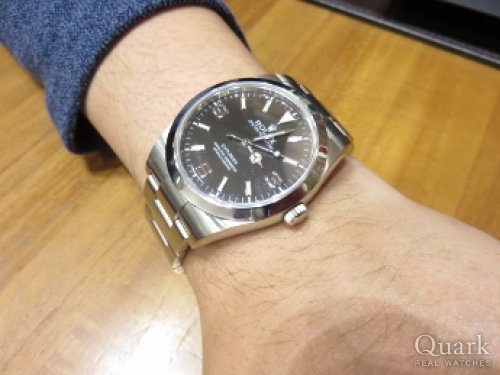 M様 この度は、クォーク神戸店をご利用頂き誠に有難う御座います。また、事前にお電話まで頂き感謝申し上げます。お選び頂いたエクスプローラーIは、文字盤の3.6.9部分に夜光が入らない「ブラックアウト仕様」と呼ばれるタイプです。既に生産が終了していますので、少しづつですが市場の流通量も減少傾向にあります。ブレスレットの無料洗浄や磁気抜きサービスも行っておりますので、お気軽にお申し付け下さいませ。今後ともクォーク神戸店を何卒宜しくお願い申し上げます。クォーク神戸店 増田