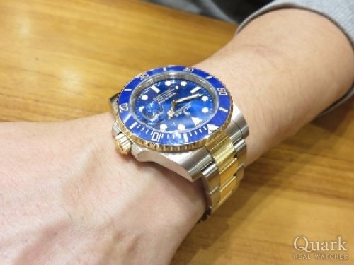T様 いつもクォーク神戸店をご利用頂き誠に有難う御座います。お選び頂いた、現行型の青サブマリーナーは以前お持ちの旧型よりもケースのラグ幅が太くなり、ブレスレットも変更されて存在感のある仕上がりとなっております。コンビモデルの中でダントツの人気を誇り、ステイタス性も抜群です。T様に大変良くお似合いでした!一生モノとして相応しい1本ですので、末永くご愛用頂ければ幸いです。アフターサービスとして、ブレスレットの無料洗浄も行っていますので三宮に来られた際は是非お立ち寄り下さいませ。また何かご不明な点などありましたら、お気軽にお問合せ下さいませ。今後ともクォーク神戸店を何卒宜しくお願い申し上げます。