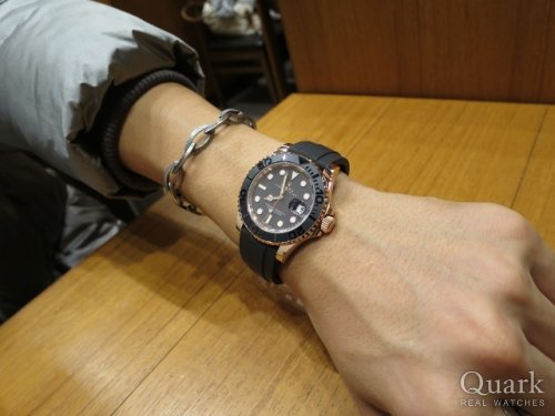 K様、この度はクォーク神戸店をご利用頂きまして誠に有難うございました。いつもこのような素晴らしい記念に、弊社をお選び下さり、心より感謝申し上げます。本当に有難うございました。今回ご購入頂きましたモデル、ヨットマスターRef.116655は、ロレックスのモデルの中では数少ないラバータイプ(オイスターフレックス)モデルで、ケースやバックルはオール18KPG(エバーローズ)仕様となります。高級感はもちろん、男らしい色のバランスなど魅力的な要素が詰まった一本です!ご試着頂いた瞬間からとてもお似合いで、見惚れるかっこ良さでございました。末永くご愛用頂けましたら幸いです。今後もご指名頂けるようしっかりとサポートさせて頂きますので、何かご要望などございましたら私井内までお申し付け下さいませ。また、ブレスレットの洗浄及び調整も無料で行っておりますので、お近くに来られた際には是非遊びにいらして下さい。心よりお待ちしております。                                クォーク神戸店 井内