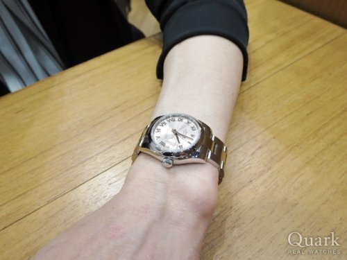 I様、この度はクォーク神戸店をご利用頂きまして誠に有難うございました。今回ご購入頂きましたデイトジャストRef.178240(ピンクローマ)は、ボーイズモデルですのでケース径が31ミリあり、レディースモデルと比べますとやや大きく実用性抜群のモデルです。負担になる程の重さも無く視認性にも優れておりますので、お仕事でお使い頂くI様に、まさにピッタリなモデルでございます!!また、I様のお色の決め手にもなりました淡いピンクの文字盤が、とても上品でローマ数字との相性も抜群です。本当に女性らしい素敵なデザインですよね。I様にとてもお似合いでございました。末永くご愛用頂けましたら幸いです。今後もご指名頂けるようしっかりとサポートさせて頂きますので、何かご要望などございましたら私井内までお申し付け下さいませ。また、ブレスレットの洗浄及び調整も無料で行っておりますので、お近くに来られた際には是非遊びにいらして下さい。心よりお待ちしております。                          クォーク神戸店 井内