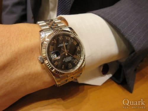 Y様、この度はクォーク神戸店をご利用頂きまして誠に有難うございました。ご購入頂きましたデイトジャストRef.116234は、5列ジュビリーブレスレットと18Kホワイトゴールドのフルーテッドベゼルの組み合わせが特徴的なデザインでロレックスの代名詞的モデルです。そして、アクセントの効いた「ブラックサンビームローマ」文字盤が絶妙にマッチする1本となります。入荷が少ないモデルですので、末永くご愛用頂ければ幸いです。また、ブレスレットの洗浄及び調整も無料で行っておりますので、お近くに来られた際には是非遊びにいらして下さい。心よりお待ちしております。クォーク神戸店 増田