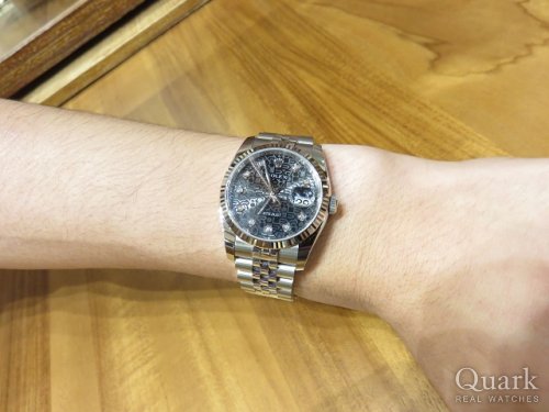 N様、この度はクォーク神戸店をご利用頂きまして誠に有難うございました。ご購入頂きましたデイトジャストRef.116234G(ブラックコンピューター)は、通常のブラック文字盤よりも手の込んだ作りで、文字盤全体にROLEXロゴの彫り込みが敷き詰められております。見る角度によって色々な表情を見せてくれる魅力的な1本です。10Pダイヤモンドとの相性も抜群で、思わず見とれてしまう美しさです!!末永くご愛用頂けましたら幸いです。今後もご指名頂けるようしっかりとサポートさせて頂きますので、何かご要望などございましたら私井内までお申し付け下さいませ。また、ブレスレットの洗浄及び調整も無料で行っておりますので、お近くに来られた際には是非遊びにいらして下さい。心よりお待ちしております。       クォーク神戸店 井内