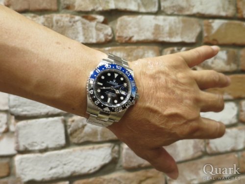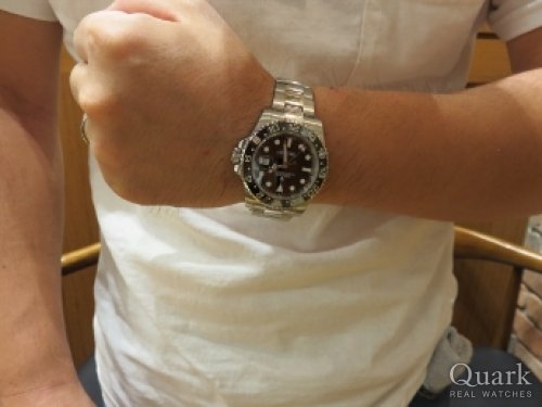 A様、この度はクォーク神戸店をご利用頂きまして誠に有難うございました。ご購入頂きましたGMTマスターIIは、最大3ヵ国の時間を表示することが可能で機能性に優れているモデルです。ブレスレットの中央部分が鏡面仕上げになっていますので、デザイン的に高級感もあります。場所を選ばずご使用頂ける1本ですので、末永くご愛用頂ければ幸いです。また、ブレスレットの洗浄及び調整なども無料で行っておりますので、近くに来られた際は是非遊びにいらして下さい。心よりお待ちしております。クォーク神戸店 増田
