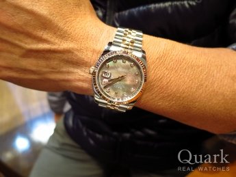 F様 この度はクォーク神戸店をご利用頂きまして誠に有難うございます。デイトジャストのなかでも滅多に入荷しないホワイトシェル(白蝶貝)は、ワンランク上のタイプです。シェルは、光の加減によって表情が変わりますので時間を見るのが楽しくなりますよ!!是非、末永くご愛用頂ければ幸いでございます。三宮にお立ち寄りの際は、お店まで遊びにいらして下さい。今後ともクォーク神戸店を宜しくお願い致します。