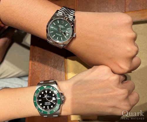 M様 いつもクォークをご利用頂きまして、誠にありがとうございます。ミルガウスに続いて、ロレックスのコーポレートカラーとなるグリーンサブ大変お似合いでした。グリーン色はロレックスの得意分野でもあり、多くのグリーンを用いた素晴らしいモデルも多くございます。コレクションとして集めて頂いても面白いかと思います。末永くご愛用頂けましたら幸いでございます。また、近くにお越しの際はブレス洗浄なお気軽にお立ち寄りください。今後ともクォーク京都店もよろしくお願い申し上げます。