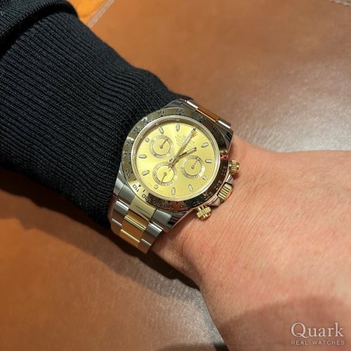 H様、いつも弊社をご利用いただきましてありがとうございます。今までゴールドが全面に出た時計は控えていらっしゃったようですが、116503シャンパンと白を試着された上で気に入っていただきありがとうございます。ダイヤルがシャンパンなのでかなり目立ちますが、服の印象でもかなり変わってくるので、意外と色んなシチュエーションで遊べると思います。これからデイトナ熱が上昇してくるかと思いますので、今後とも末永いお付き合いのほどよろしくお願いいたします。