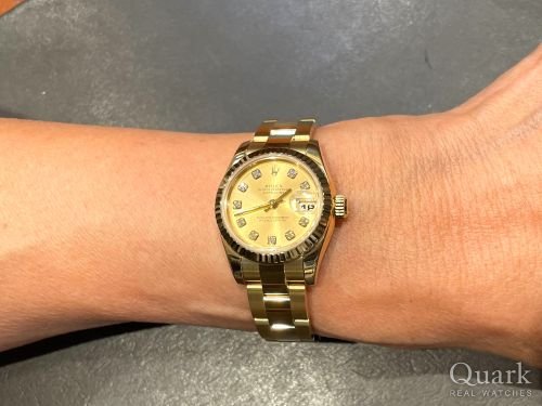 D様、本日はご来店いただきありがとうございます。ゴールドの種類や文字盤が豊富なDATEJUSTで、高級感のあるイエローゴールドとシャンパンダイヤルが、上品なD様に非常にお似合いでした!コンディションが非常に良いこちらの時計をご案内できたこと、大変嬉しく思います。何か困ったことがございましたら、お気軽にクォーク広島店曽根までお問い合わせくださいませ。今後とも末永いお付き合いの程、よろしくお願い申し上げます。