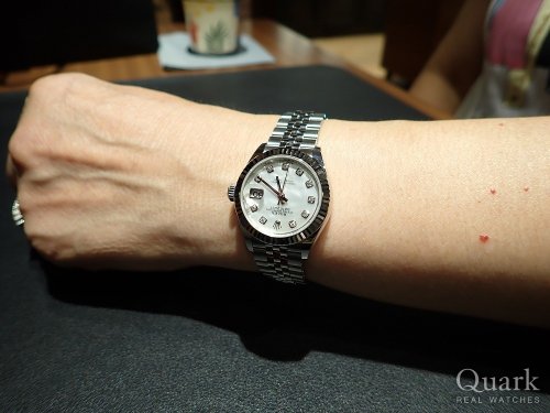 Aki女士,非常感谢您光顾夸克沙龙大阪店。恭喜您寻找到您喜欢的手表款式,白贝母表盘的日志手表非常搭配您的气质!能够帮助您选购这款手表,我感到非常的开心,也很荣幸。希望您可以长久的使用这款手表,也希望它可以给您带来很多美好的回忆!下次来大阪玩的时候,非常欢迎您再次光临夸克沙龙大阪店。