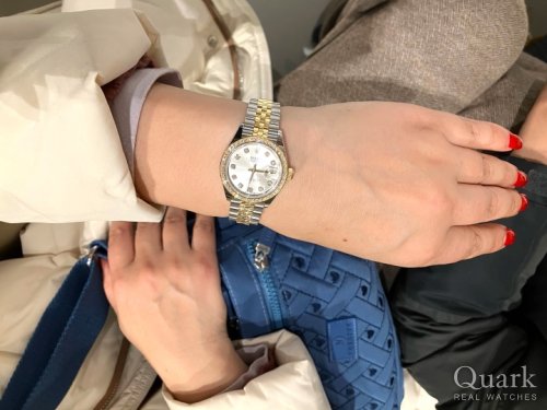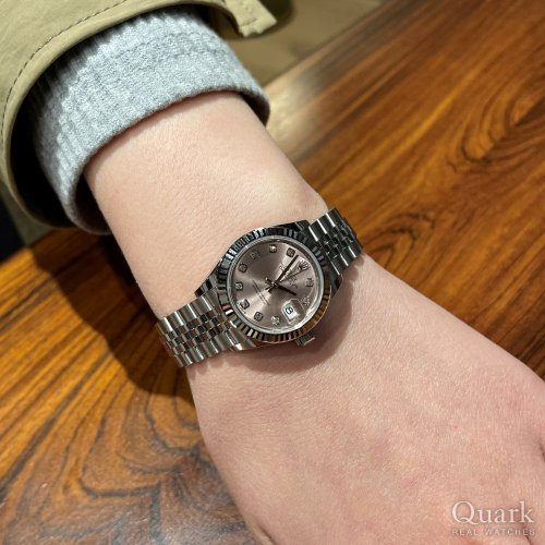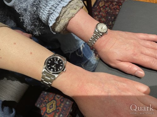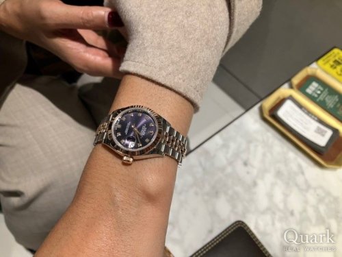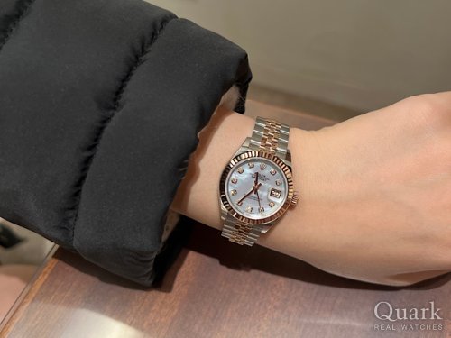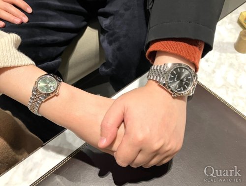 結婚10周年記念に妻へのサプライズプレゼントで購入を検討。当初は内緒で購入しようと思っていましたが、流石に私の趣味で高額な時計を選ぶより、長年使って頂く妻が好きなモデルを選んだ方が良いと思い、一緒にクォークさんに訪れて購入しました。一応結婚10周年記念でROLEXの時計をプレゼントする話をしたら驚いて喜んでくれたのでサプライズは成功かな!?