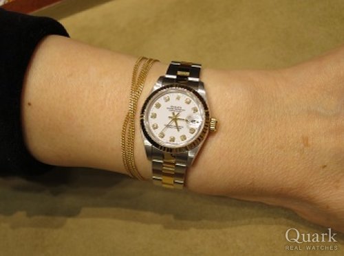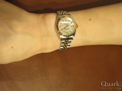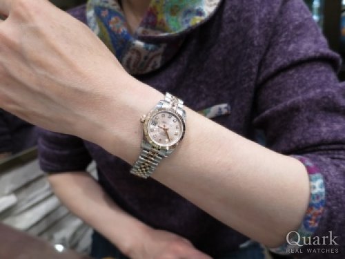 この度はクォーク銀座888店のご利用誠にありがとうございます。イエローゴールドのレディースデイトジャストでは滅多に見ないオイスターブレス。爽やかなホワイトの文字盤にさりげないダイヤが入っているデザインがまた魅力的です。気に入ったモデルのご購入のお手伝いが出来、私も嬉しく思います。お仕事柄、色々な海外でご利用頂けましたら幸いです。今後もメンテナンスなどで気になる点等ございましたらお気軽にご連絡下さいませ。これからもしっかりサポートさせて頂きます。今後とも宜しくお願い申し上げます。
