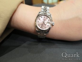 I様 この度はクォーク梅田店ご来店並びにご利用いただき誠に有難うございます。こちらのお時計はピンク色がとても女性らしさがあり、それに加え文字盤の10ポイントダイヤがゴージャスで際だち、ピンク色とも相性の良いとても素晴らしいお時計だと思います。ピンク色がやはりお似合いでした。またご不明点等ございましたらお問い合わせくださいませ。またのご来店心よりお待ちしております。クォーク梅田店 平田