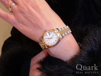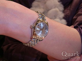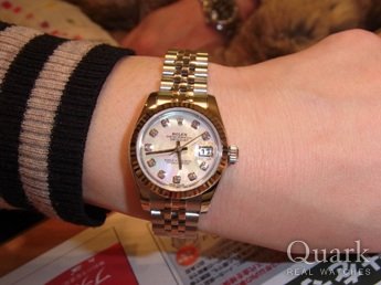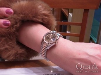 ショップで一目見たときから、このチョコブラウン(6時ダイヤ)に決めていました。再度来店したときには、同じデイトジャストのブラック10Pダイヤと(ほかにシャネル)と悩みましたが、仕事中に着けても上品さと可愛らしさがあり、やっぱり一番最初に気に入ったデザインに決めました。