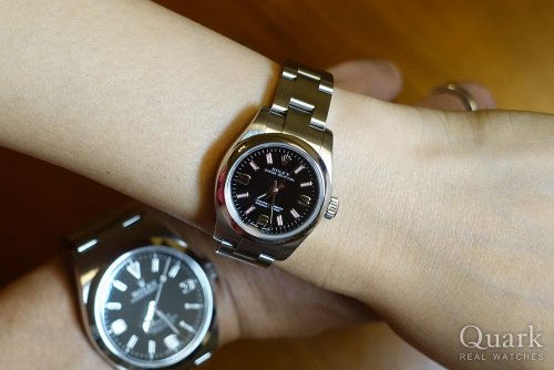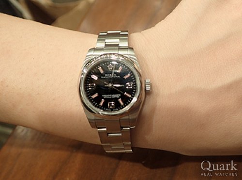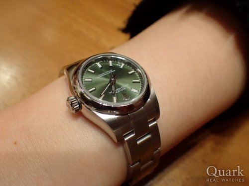 F様 クォーク上野本店をご利用頂き誠に有難うございます。今回ご購入頂いたOysterPerpetual26 Ref.176200はクロノメーター認定を受けており前モデルに比べ高精度で、更にケースサイズが2mmサイズアップしており、小さすぎず程良い着け心地を楽しめて頂けるかと存じます。また、今回は奥様へのプレゼントということでしたがサイズは如何でしょうか。もしサイズが合わないようでしたら、ブレスレットの調整はもちろん、洗浄も無料で行っておりますので上野へ来られた際には是非弊社をご利用くださいませ。また、ご質問などございましたら長谷部までお気軽にご相談くださいませ。今後とも末永いお付き合いの程、宜しくお願い致します。