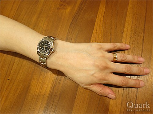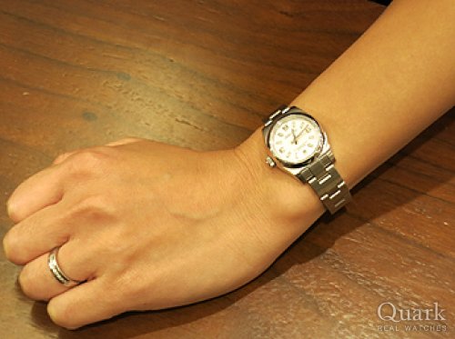 ボーイズモデルと悩みましたが、やはり長く使うことを考えて、レディースモデルに決めました。シンプルなデザインの中にあるピンクのアクセントが気に入っています。また、クォークさんの長期保証がロレックス購入の大きな後押しになりました。