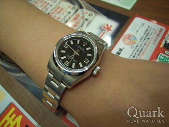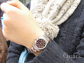 シンプルなオイスターパーペチュアルのピンク文字盤を考えていましたが、実際に時計を見て、他の人といっしょにならない黒文字盤のピンクにしました。