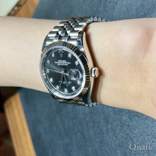 H様、この度は数ある時計店からクォーク仙台店をご利用いただき誠にありがとうございます。この度お求めいただきました『DATEJUST Ref.126300』は、迫力のある41mm径ケースとシンプルで無駄の無いデザインの組み合わせで、重厚かつフォーマルな佇まいが感じられる美しいモデルでございます。スレートローマダイヤルは光の当たる角度で表情を変える美しいカラーリングがベースとなっており、インデックスはローマ数字で、コーポレートカラーのグリーンを縁取りに採用した、立体感を感じるロレックス屈指の人気文字盤です。