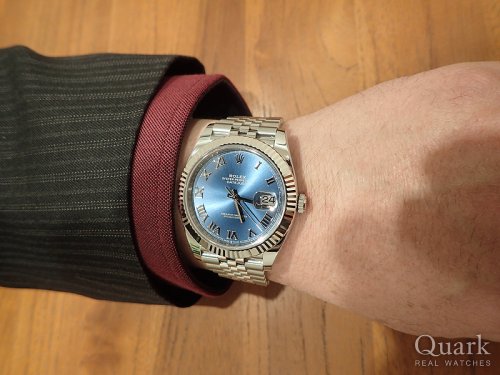 鮮やかなブルー文字盤とかっこいいローマ文字盤のデザインに感動しました!もう1本のデイトジャストと共に大人のロレックス感を楽しみたいと思います。