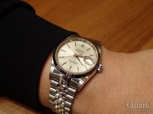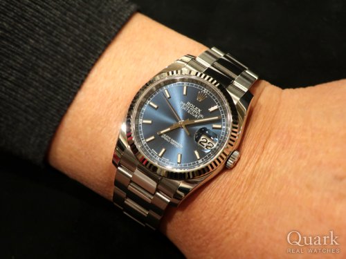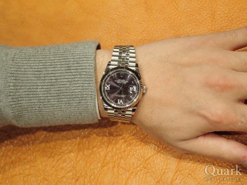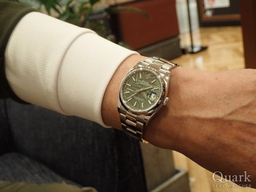 以前にRef.118206とRef.16622を着けていたが、使い勝手と重量から考えてRef.126200のオリーブグリーンパームモチーフにしました。当初は正規店で検討していたが、一向に購入できる兆しが無く、諦めてクォークさんを頼りました。サイズ感、軽さ、文字盤デザインなど私好みで気に入っています。