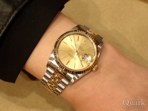 この度は、クォーク仙台店をご利用頂きまして誠にありがとうございます。今回、E様がお選び頂いたお時計はDATEJUST Ref.16233シャンパンでございます。デザインとしてはシンプルさが特徴的なDATEJUSTではございますが、素材がステンレス+イエローゴールドコンビ、ダイヤルがシャンパンであることで、格段に高級感が増しております。また、ジュビリーブレスである点も、その雰囲気を後押ししており、全体的に煌びやかさが印象的です。ダーティなE様には、まさにお似合いのお時計かと存じます。末永くご愛用頂けたら幸いです。尚、私どもではブレス洗浄サービスを行っておりますので、お時間ある際や、近くへお越しの際は、是非お立寄り下さいませ。今後とも変わらぬご愛顧を賜ります様、宜しくお願い申し上げます。  クォーク仙台店 沼澤