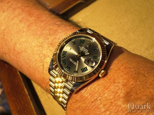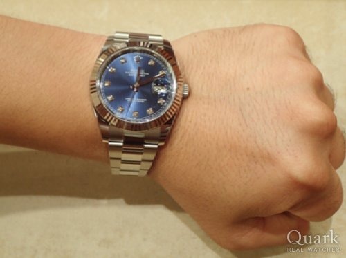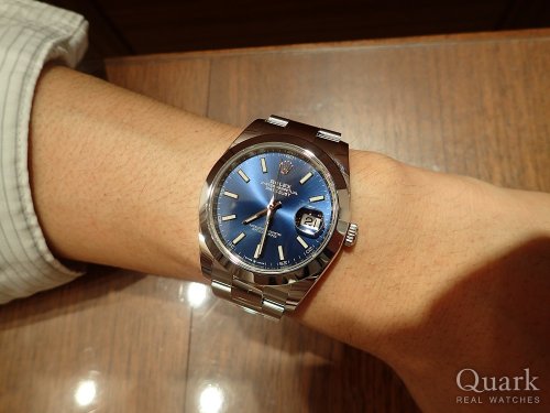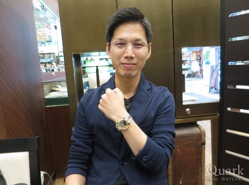 T様:この度はクォーク名古屋店をご利用下さいまして誠にありがとう御座います。DATEJUSTは文字盤の色目が豊富にご用意のあるモデルで御座いますので色々と迷われますよね。その中でもこの度ご購入頂いたブルーダイヤルは、鮮やかなブルーの色合いと光り方で幾重にも色目が変化するダイヤルが非常に人気の高い御時計となっております。T様もそのデザインを凄く気に入られておりましたね。サイズ感も良くお似合いで御座いました。今後も御時計の事で気になる事など御座いましたら何時でもご相談下さいませ。心よりお待ち申し上げます。 クォーク名古屋店 藤原