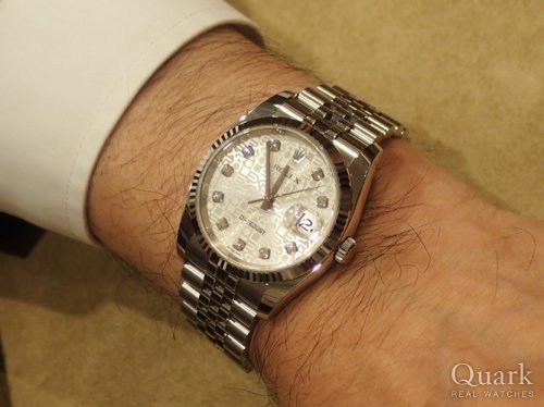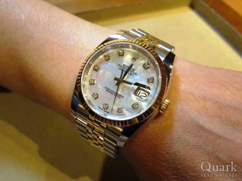 N様 この度は数ある時計店の中からクォーク上野本店をご利用頂き誠にありがとうございます。今回はDATE-JUST Ref.116233NGホワイトシェルダイヤルのご購入のお手伝いが出来た事、大変嬉しく思います。ブレスレットの中央やベゼル・リューズに18Kイエローゴールドを施したエレガントなデイトジャストです。文字盤には天然の真珠母貝(マザーオブパール)を使用し大粒のダイヤモンドを10個があしらわれたオシャレなモデルです。天然素材となり1点1点に個体差がでるため、自身だけの色味と輝きを手にすることができる魅力がある1本です。 ご使用頂きしっかりとサポートさせて頂きますので今後、お時計の事で何かございましたらお気軽にご相談下さいませ。宜しくお願いいたします。