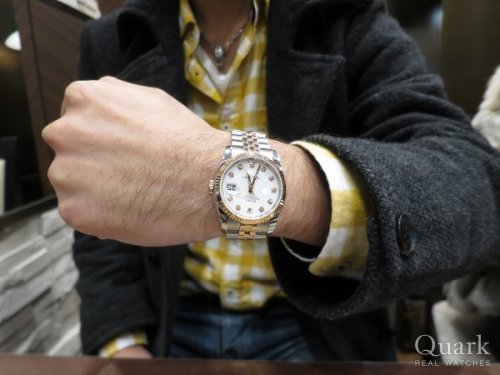 Y様 この度クォーク上野本店をご利用いただき誠にありがとうございます。今回Y様にタイミング良くデイトジャストをご案内でき大変嬉しく思っております。ご購入いただきましたRef.116231NGは、天然素材シェルの文字盤に10個のダイヤモンドが施された気品溢れるモデルでございます。また、日本にいらした際は是非遊びにいらして下さい。今後とも末長いお付き合いの程、どうぞ宜しくお願い致します。クォーク上野本店 岩間