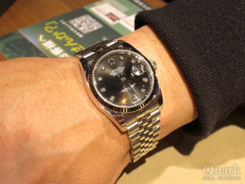 W様 この度はクォーク上野本店をご利用いただき誠にありがとうございます。ご購入いただきましたデイトジャストRef.116234Gは、ブラック文字盤に10個のダイヤモンドが施されている気品溢れるデザインでございます。また、36mmのケースサイズは腕元にフィットしやすく使いやすさも魅力的なモデルですので、是非これからご堪能下さいませ。また、何かご不明な点等がございましたらお気軽にご連絡くださいませ。今後とも末長いお付き合いの程、どうぞ宜しくお願い致します。クォーク上野本店 岩間