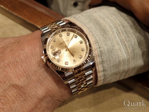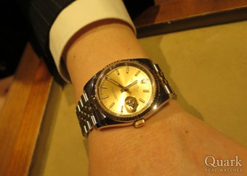 M様 いつもクォ―ク上野本店をご利用頂き誠にありがとうございます。今回はデイトジャストRef.116233シャンパンダイヤルのご購入のお手伝いが出来た事、大変嬉しく思います。ロレックスの代名詞的存在のデイトジャストでベゼル・ブレス中央に18KYGを使い、貫禄のある高級感を演出いたします。またここ最近、大きめの時計が多く出回っている中、36mmの小振りなデザインが普段でも使い易いと人気の理由の一つでもあります。ご使用頂きしっかりとサポートさせて頂きますのでまた、お時計の事で何かございましたらお気軽にご相談下さいませ。宜しくお願いいたします。