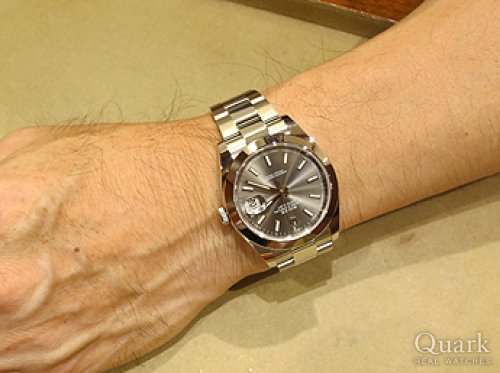 シンプルなデザインで、ダークグレーの色目も新鮮に感じました。個人的にはデイトジャストIIよりもデイトジャスト41の方がシャープなデザインなので、小振りに見えて軽く着け易いと思いました。