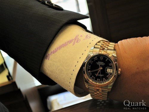 いつもクォーク横浜店をご愛顧賜り誠にありがとうございます。今回は海外発注という事でお待たせしてしまいましたが、何とか2本同時にご案内ができ、私もホッとしております。ピンクゴールドとブラック文字盤の組み合わせがとてもゴージャスで、Y様にとても良く似合っておりました。これまで沢山ご購入いただいていながら、意外にも初めての36ミリデイトジャストだったとは私も驚きです!色々なお時計をご愛用いただいているY様だからこその感想を、お待ちしております!今後ともクォーク横浜店をよろしくお願いいたします。