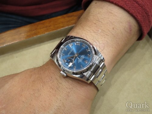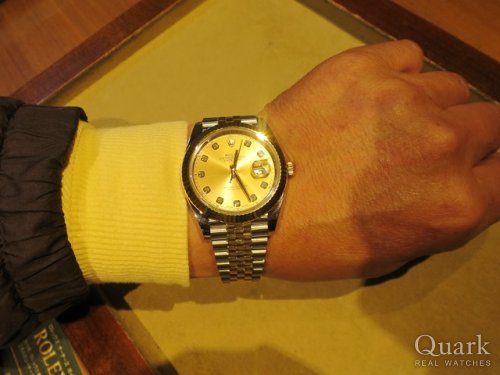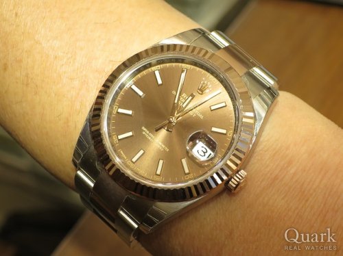 DATEJUSTⅡ(Ref.116333)からの買替で購入しました。イエローゴールドに比べて渋い印象で派手過ぎず腕への収まりが良く気に入ってます! ローマ数字文字盤があれば文句の付けどころがないのに残念・・・。また近く寄った際は遊びに行きます!