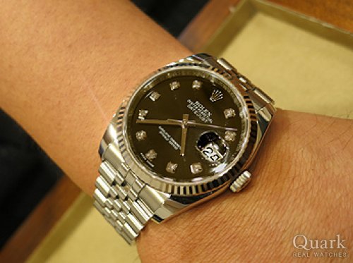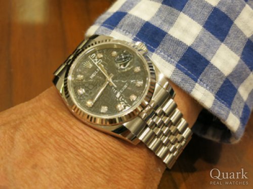 M様 この度は、クォーク心斎橋店をご利用頂き誠にありがとうございました。お問い合わせ頂いた時に色々とお時間を頂きありがとうございました。デイトジャストの10Pダイヤモンドは、他にはない存在感と満足感は抜群です。コンディションも良い時計ですので、末永くご愛用頂ければ嬉しく思います。また、ブレスレットのクリーニングもサービスで行っておりますので、お近くにお越しの際には是非ともお立ち寄り下さいませ。お待ちしております。今後ともクォークを宜しくお願い致します。心斎橋店 西川
