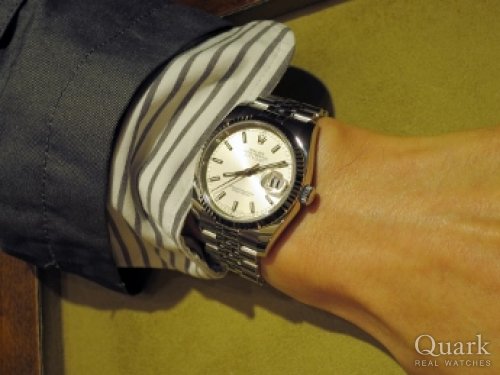 デイトジャストに興味を持ってから、ずっと気になっていたアルファハンドのデイトジャストを購入できて大変嬉しいです。針もさることながらインデックスの形状や程良い焼けのダイヤル、珍しい3ラインのベゼルがマッチした雰囲気の良い個体で、とても気に入っています。また、購入にあたりアドバイスをくれた上野本店の佐藤君、仙台店の佐野さん、ありがとうございました。ブレス調整に奮闘してくれた古賀君にも感謝しています。古賀君の調整している姿に、職人魂を感じました。いつも笑顔で対応してくれる仙台店スタッフにも感謝しています。アンティーク時計を購入するなら、是非クォーク仙台店で!
