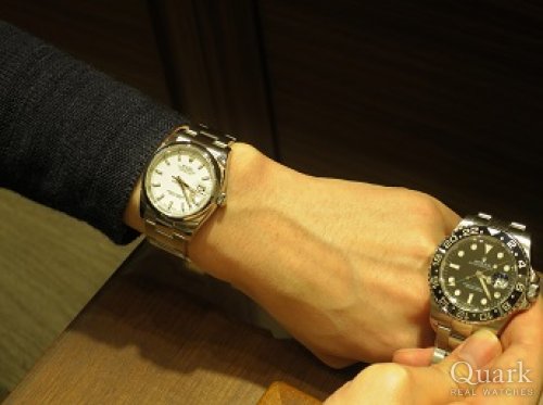 いつもクォークをご利用頂きまして誠にありがとうございます。これまでにお使い頂いたロレックスとは少し印象の異なるデイトジャストは、程よいサイズ感で着け心地も良いですよね!どうしても回転ベゼルが付くとゴツくなりがちですが、デイトジャストはスッキリしていてスーツにも抜群の相性です。探すと意外と少ない白文字盤のバーインデックス、見つかって本当に良かったです!いくつかのクォークの店舗をご利用頂いたようで、嬉しいお言葉まで頂き、私(長本)も前野も嬉しい気持ちでいっぱいです。ブレス洗浄はいつでも承りますのでお気軽にお越し下さいませ。またお会い出来る日を楽しみにしております。 クォーク横浜店 長本/前野