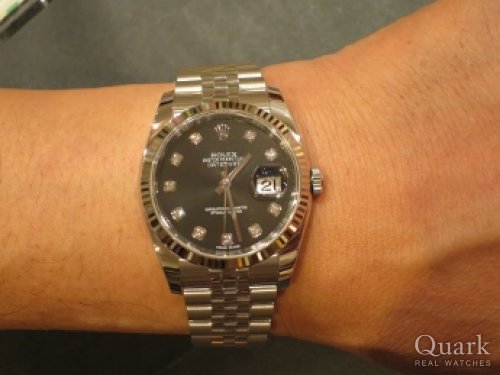 デイトジャストの10Pダイヤを持っていますが、購入時に横に並んでいて、気になっていたモデルだったので、Ref.16233NR(ホワイト)を選びました。 シェルの文字盤が綺麗で良い!! クォークさんの対応は、何も言う事ない。 全てがベストで、用意が早い。 安心して購入する事が出来ました。
